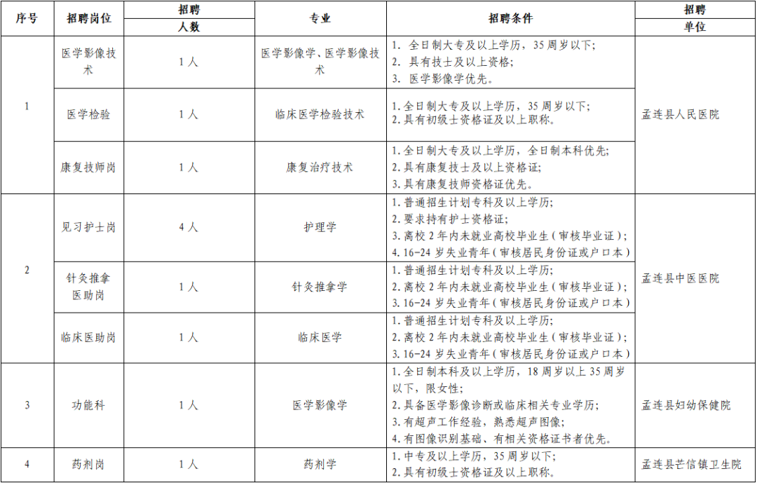 为加强孟连县紧密型医共体人才队伍建设,改善人才队伍结构,结合医共体人才招聘计划,遵循“公开、平等、竞争、择优”的原则,医共体总院县人民医院公开招聘编外合同制医学影像技术1名、医学检验学1名、康复技师1名,中医医院院招聘见习岗6名,妇幼保健院招聘医学影像学1名,芒信镇卫生院招聘药剂岗1名,现将有关招聘事宜公告如下: