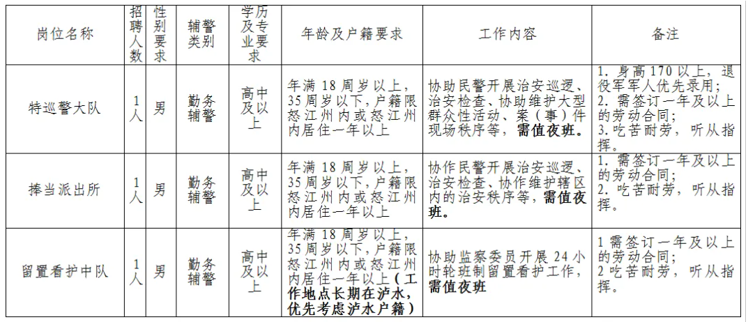 2.装备保障:由单位统一配发制式服装;3.食宿安排:工勤食宿自理,执行留置看护任务期间,单位提供食宿;看护任务空档期返回贡山县看守所工作期间,食宿不再由单位提供。