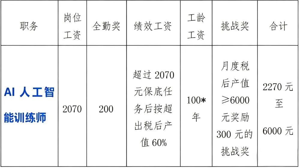 综合薪资:2270元-6000元/月,基本薪资2070元+全勤工资200元+绩效工资(超过2070元保底任务后按超出税后产值的60%计提)+工龄工资100元/年+月度挑战奖300元,转正后签订正式劳动合同,购买社保。
