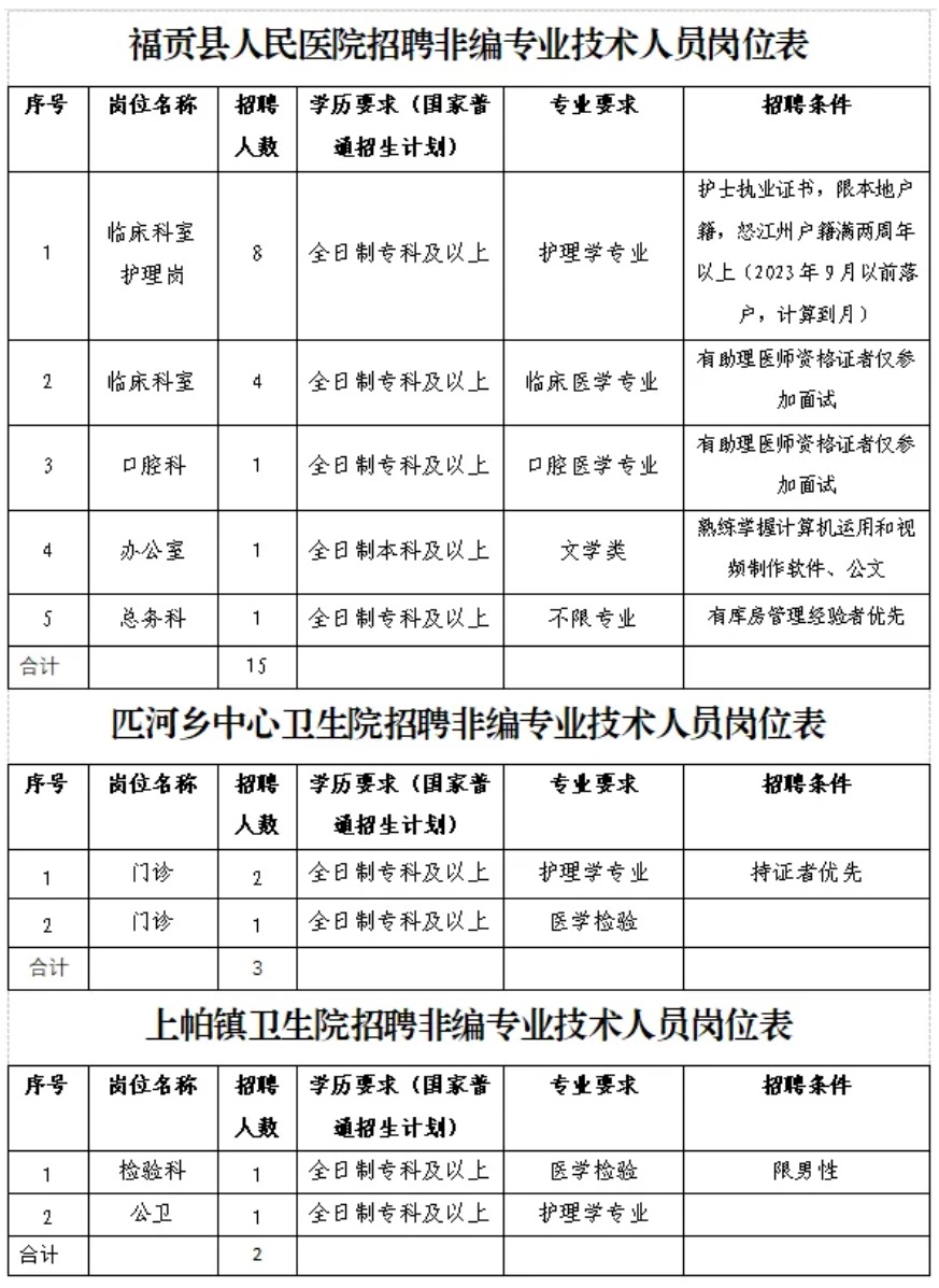 福贡县人民医院拟招聘专业技术人员15名;上帕镇卫生院拟招聘2名,匹河乡中心卫生院拟招聘专业技术人员3名(住宿安排)。