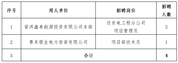 普洱鑫泰能源投资有限公司(以下简称“鑫泰公司”)为满足鑫泰公司本部及各单位用人需求,决定面向社会公开招聘4名工作人员,现将招聘事项公告如下: