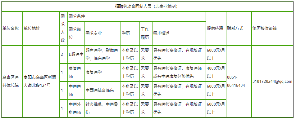 贵阳市乌当区医共体总院是乌当区唯一的一家公立非营利性二级甲等综合医院、爱婴医院,是乌当区人民医院、区妇幼保健院与区中医医院、5家社区卫生服务中心、8家乡镇卫生院共同组建的“紧密型县域医疗共同体”。为进一步加大医院学科建设,着力优化人才队伍结构,全面提升医疗服务救治能力,更好满足广大群众就医需求。经研究,决定面向社会招聘5名非编制人员。