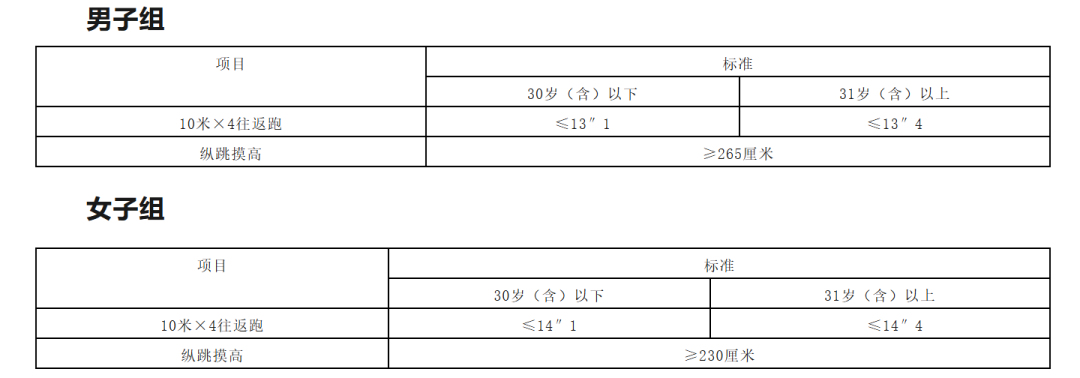备注:10米×4往返跑每人最多可测2次,1次测评达标即视为该项目测评合格;纵跳摸高每人最多可测3次,1次测试达标即视为该项目测试合格。