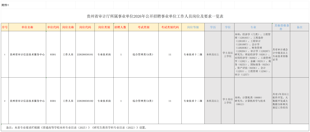 面向社会公开招聘专业技术人员2名。具体招聘岗位及要求见《贵州省审计厅所属事业单位2026年公开招聘事业单位工作人员岗位及要求一览表》(附件1)。岗位表中要求的基层工作经历时间计算,截止时间为报名日最后一日。关于基层工作经历的范围界定和时间计算,详见附件3。