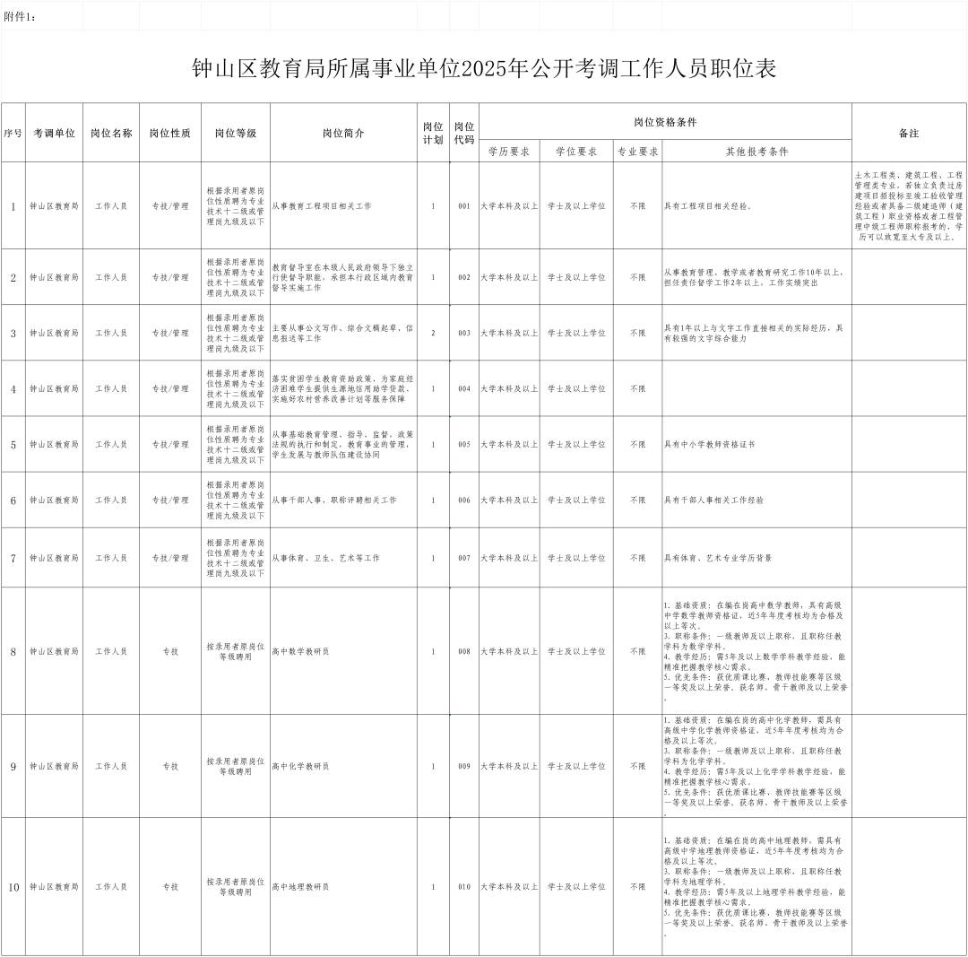 考调岗位详见《钟山区教育局所属事业单位2025年公开考调工作人员职位表》(以下简称《职位表》,见附件1)