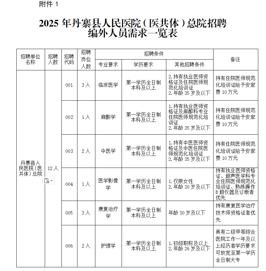为进一步加强丹寨县医疗卫生人才队伍建设,满足医共体总院业务发展需要,经县卫生健康局审核批准,现面向社会公开招聘编外工作人员,具体事项公告如下: