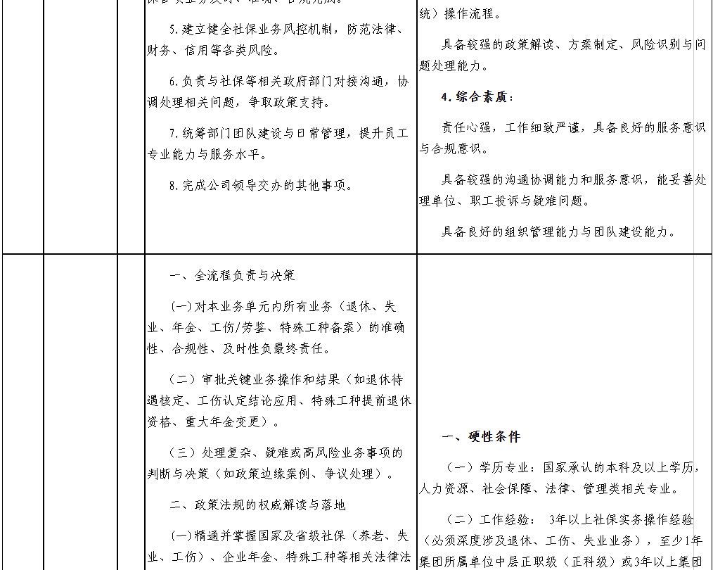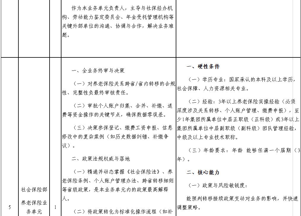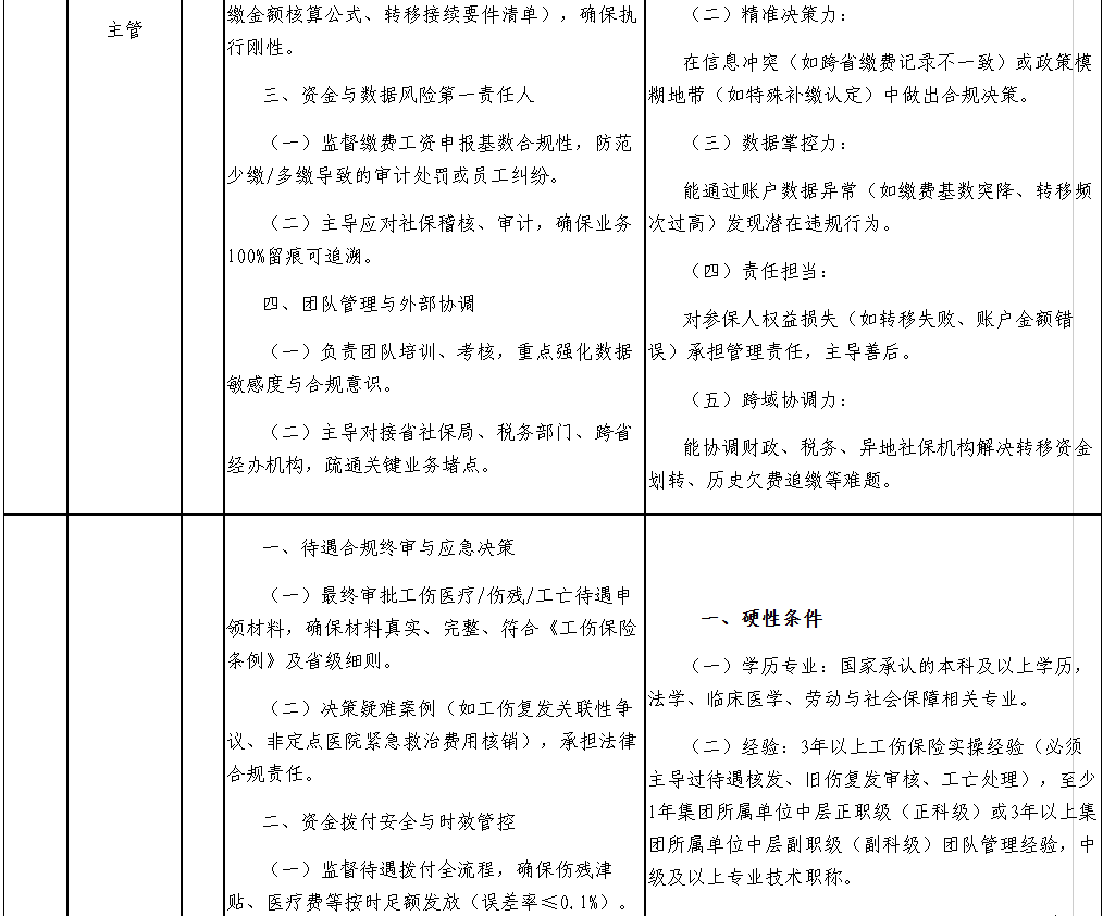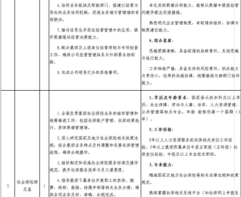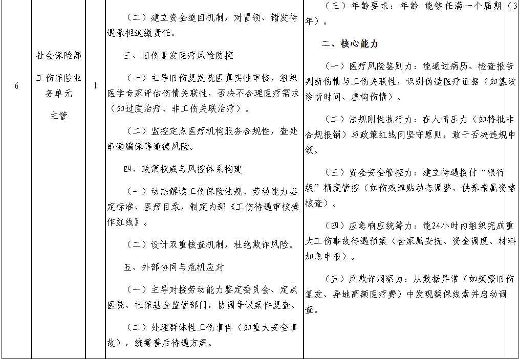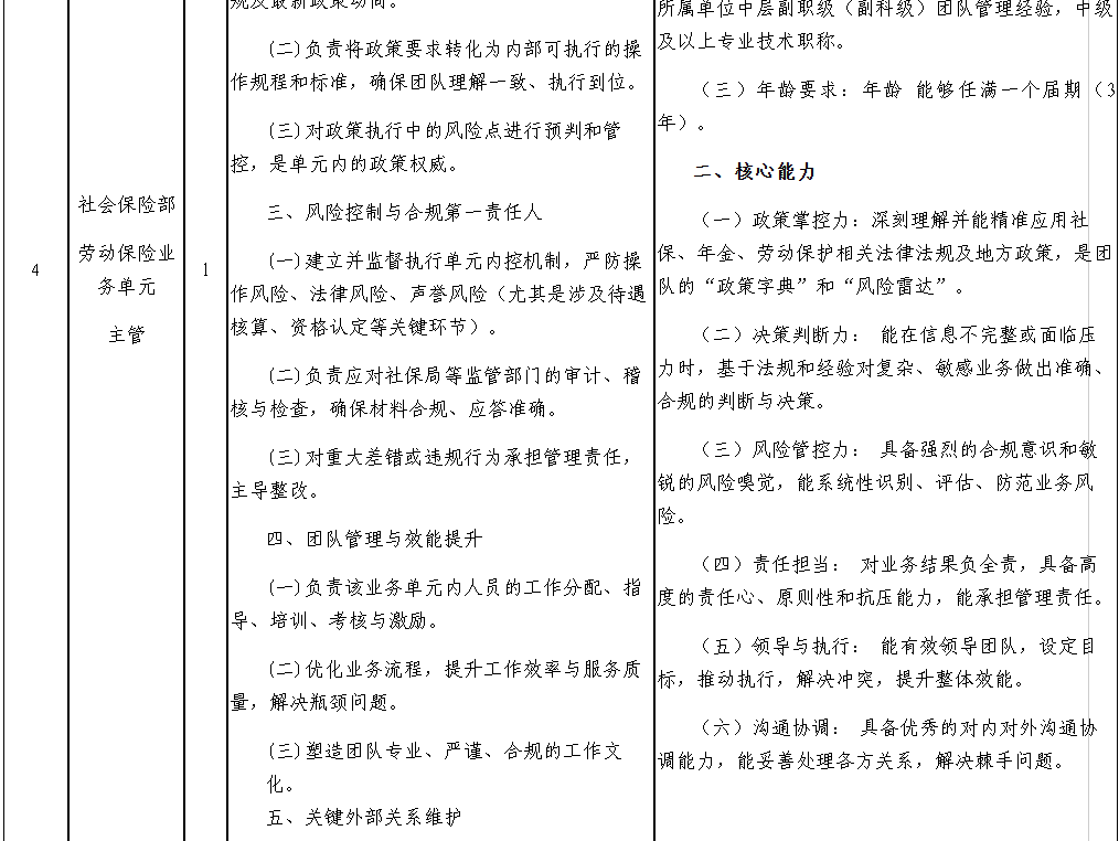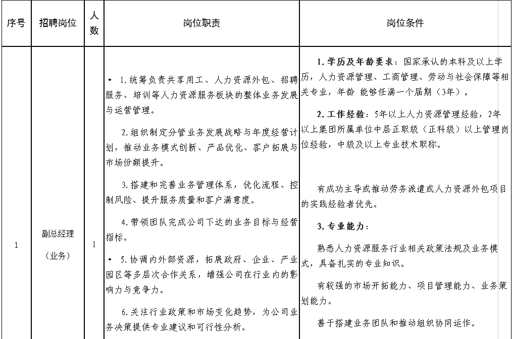 人力资源公司副总经理2名(业务、经营),社会保险部总监1名,社会保险部劳动保险业务单元主管1名,社会保险部养老保险业务单元主管1名,社会保险部工伤保险业务单元主管1名,具体要求见附表。