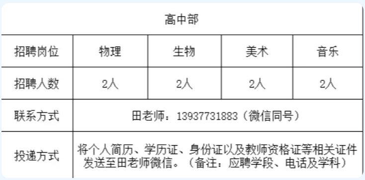 (1)有意者可直接联系田老师(电话微信同号:13937731883)投递简历,并在简历上注明“姓名+科目(岗位)+电话”如:张三高中语文13xxxxxxxxx。个人简历须详细描述个人基本情况、学习经历、工作经历、获奖情况等,并附个人手机号码。