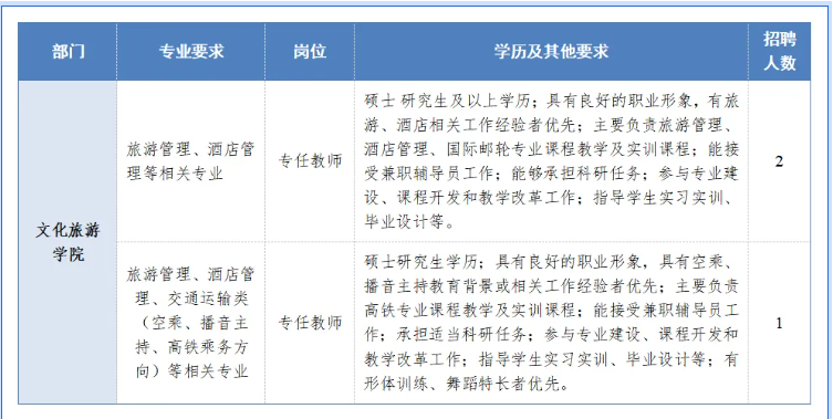 根据学校文化旅游学院发展需要,2026年面向社会招聘3名教师。