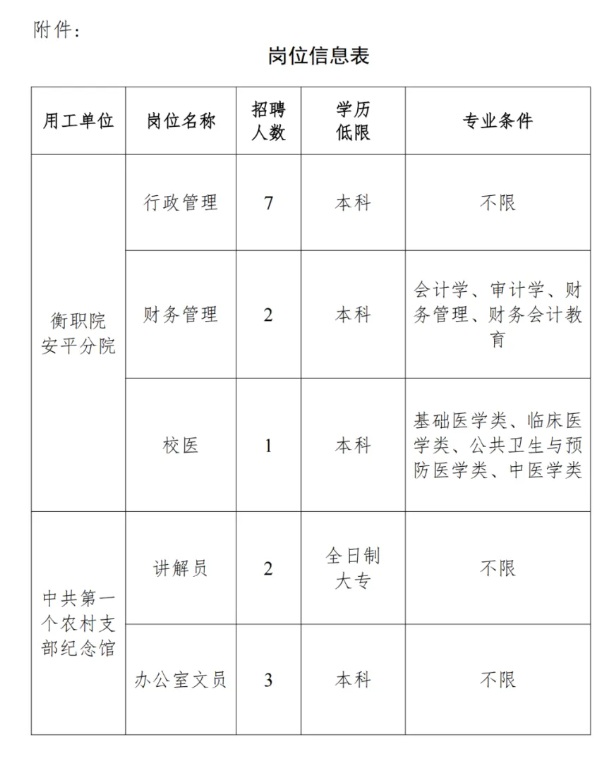 因工作需要,中国共产党第一个农村支部纪念馆和安平县综合职业技术学校(衡水职业技术学院安平分院)现面向社会公开招聘派遣制辅助工作人员。为顺利推进招聘工作,现将有关事项公告如下: