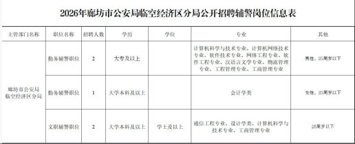 为充分利用社会优质人力资源,提高行政效能,根据实际工作需求,廊坊市公安局临空经济区分局现面向社会公开招聘警务辅助人员。