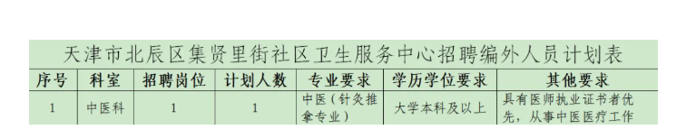 具体招聘的岗位、人数和条件详见附件1《北辰区集贤里街社区卫生服务中心招聘编外人员计划表》,报考人员从2026年2月4日开始,通过微信公众账号(集贤里街社区卫生服务中心)查询。