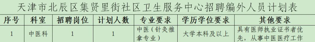 具体招聘的岗位、人数和条件详见附件1《北辰区集贤里街社区卫生服务中心招聘编外人员计划表》,报考人员从2026年3月11日开始,通过微信公众账号(集贤里街社区卫生服务中心)查询。