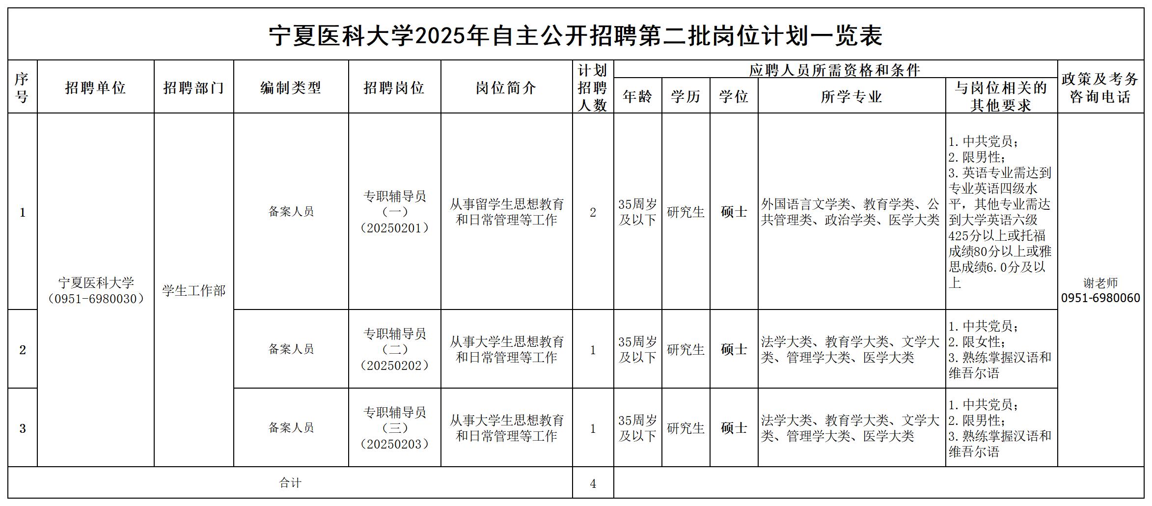 本次共招聘硕士4人(备案人员),详见《宁夏医科大学2025年第二批自主公开招聘岗位计划一览表》(附件)。