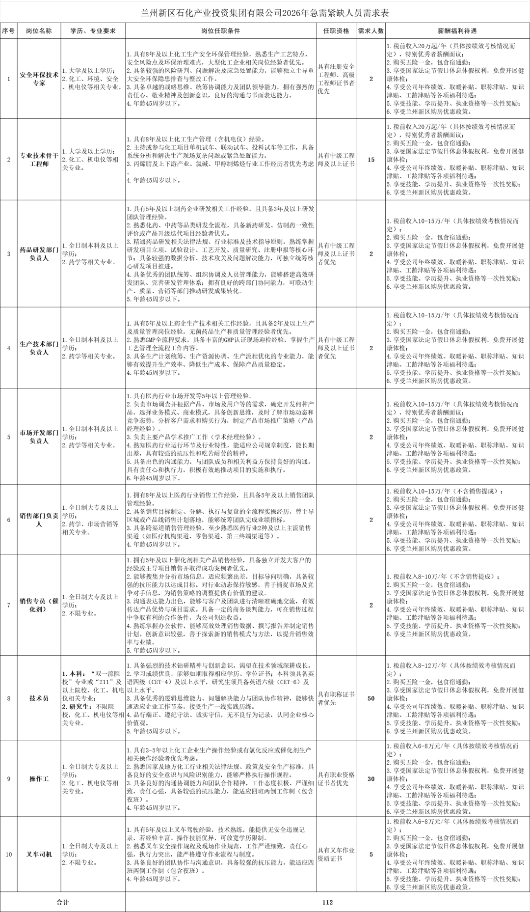 现因发展需要,面向社会公开引进安全环保技术专家、专业技术骨干工程师、药品研发部门负责人、生产技术部门负责人、市场开发部门负责人、销售部门负责人、销售专员(催化剂)、技术员、操作工、叉车司机共计112名,具体事宜公告如下: