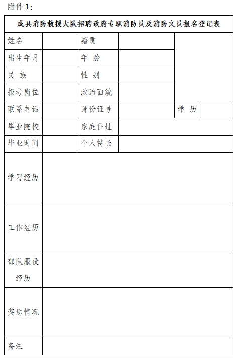 (3)填报《成县消防救援大队招聘消防员及消防文员报名登记表》(需提前下载填写完整,报名表右上角粘贴照片处贴好2寸近期个人蓝底正面免冠照片,并现场提交);