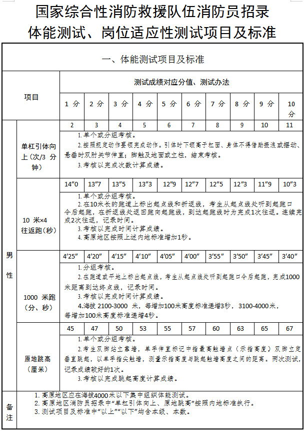 (3)测评内容:体能测评项目及标准参照《国家综合性消防救援队伍消防员招录体能测试项目及标准》(附件)执行,实行单项淘汰制,占考试总成绩的60%。体能测评具体项目及标准见附件2。