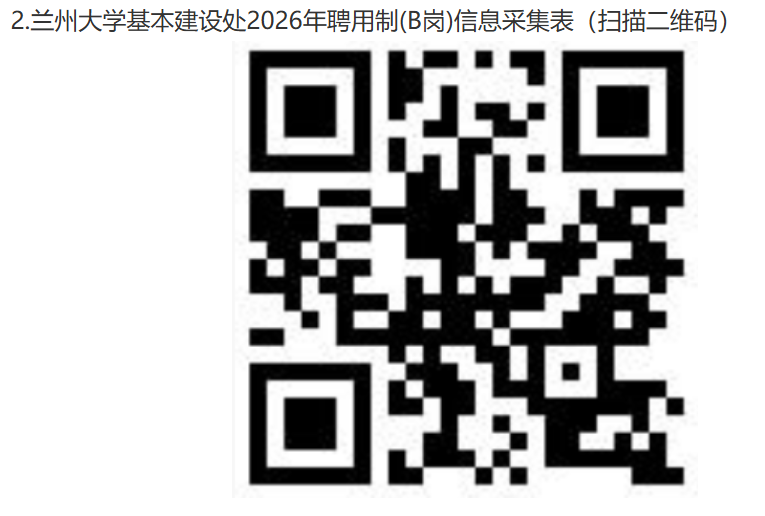 2.填写《兰州大学基本建设处2026年聘用制(B岗)人员应聘报名表》(附件1),提供个人简历、身份证、学历学位证书、获奖证书等证明材料扫描件,并将《报名表》和证明材料合成为1个PDF文档(文件命名及邮件主题均为“姓名+应聘B岗材料”),发送至jjc@lzu.edu.cn,同时扫描二维码(见附件2)填写《兰州大学基本建设处2026年聘用制(B岗)信息采集表》。未按要求提供材料和填写信息采集表者不予受理。