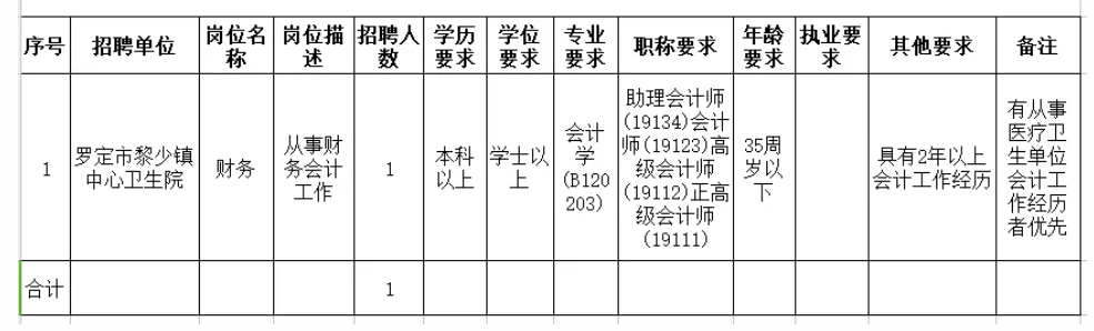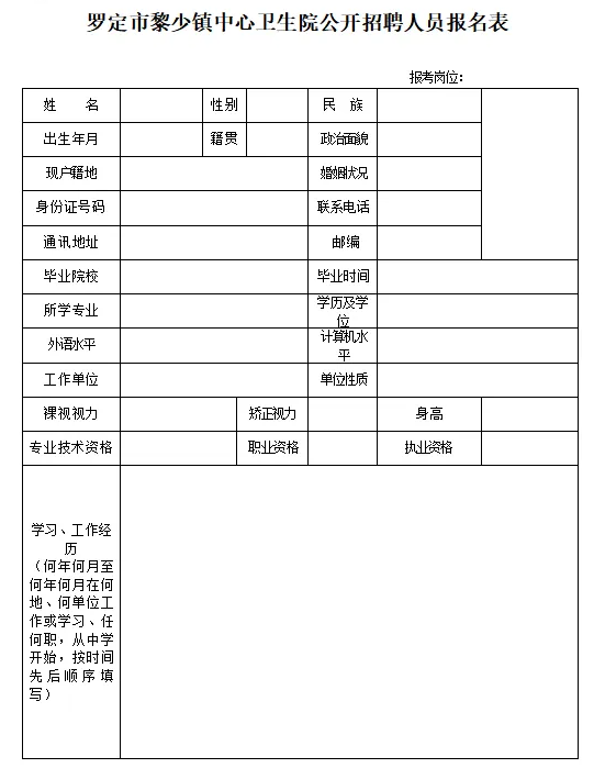 ⑷《罗定市黎少镇中心卫生院招聘编外人员报名表》(双面打印)1份(报考者提前填报好,现场报名时一并提交)。