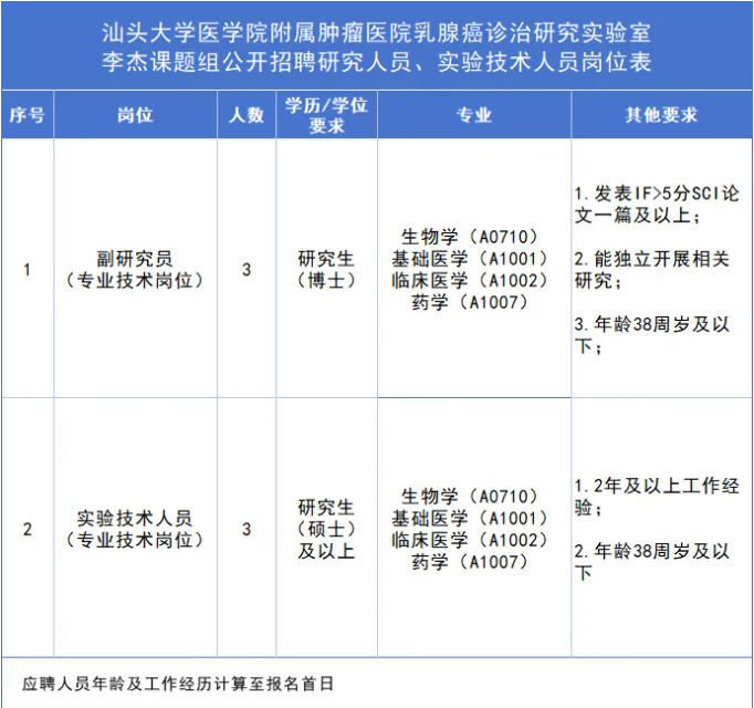 6.招聘公告要求的其他条件,详见《汕头大学医学院附属肿瘤医院乳腺癌诊治研究实验室公开招聘研究人员、实验技术人员岗位表》。