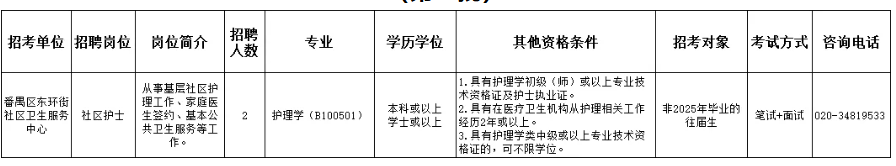 2.其他条件:详见《广州市番禺区东环街社区卫生服务中心2025年招考编外人员岗位一览表(第二批)》。具备报考岗位所需的专业、学历、学位或执业资格和技能要求及其他条件。被录用人员在接到通知报到时,必须提供相应的学历证、学位证、资格证、执业证,未能提供的不予录用。应考人员的学历、学位和专业技术资格等,需国家承认。