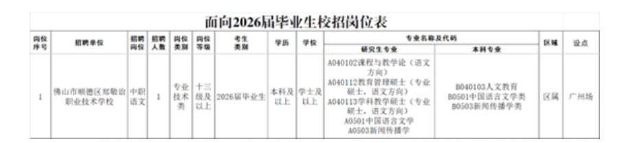 佛山市顺德区郑敬诒职业技术学校拟面向2026届毕业生赴高校设点公开招聘有编制教师1名。招聘岗位:中职语文1名。