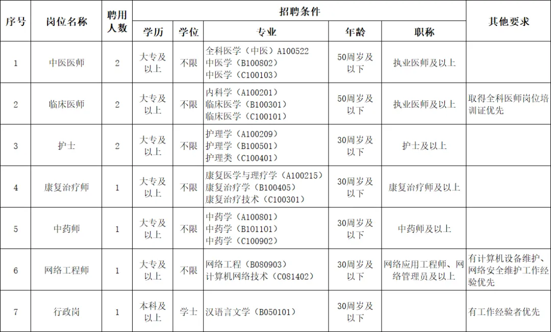本次共招聘事业单位编外聘用人员10名。具体招聘岗位、学历、年龄、专业及其他要求详见下表: