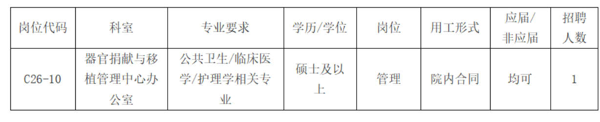因工作需要,我院器官捐献与移植管理中心办公室面向社会公开招聘管理岗位人员1名,现将有关事项公布如下: