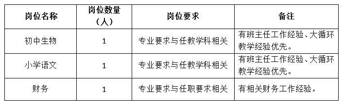 (一)教师岗位:具有教师资格证;本科及以上学历,专业符合学科要求;年龄35周岁以下;有普通中小学教学经历者优先考虑。