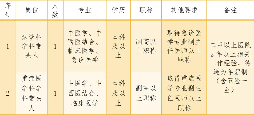 因医院发展需要,现面向社会招聘急诊科学科带头人、重症医学科学科带头人,现将有关事项通知如下: