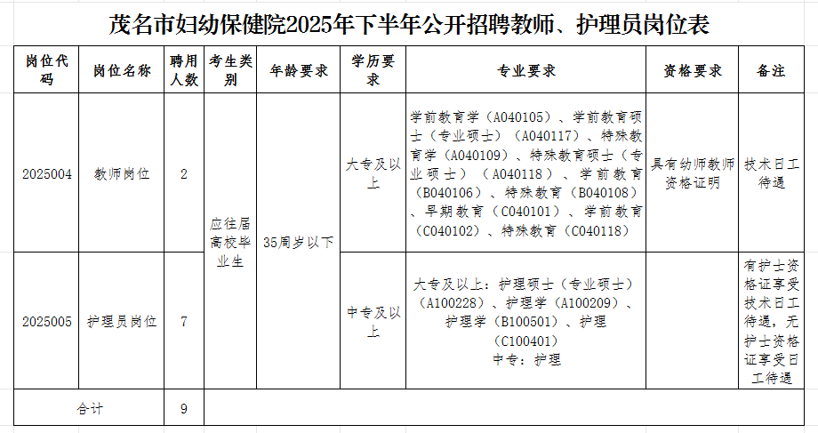 拟聘用人员录用为日工或者技术日工,试用期为三个月。执行茂名市妇幼保健院规定的薪酬待遇。