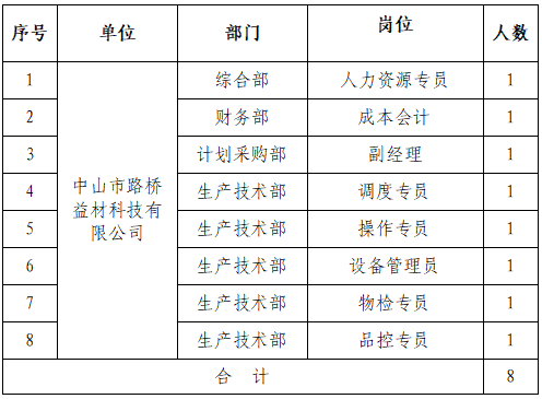 具体任职条件与岗位职责要求,详见《中山市路桥建设有限公司专业人才招聘岗位信息表》(附件1)。