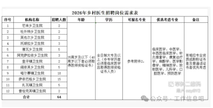 乡镇卫生院村卫生室乡村医生岗位。具体岗位需求请参考附件1。