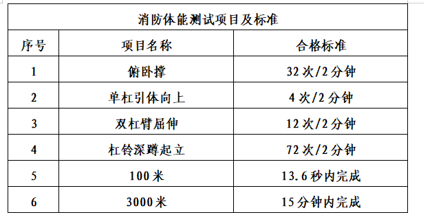 (三)体能测试:消防员需进行体能测试,各项体能项目测试成绩均合格者进入面试/笔试环节。