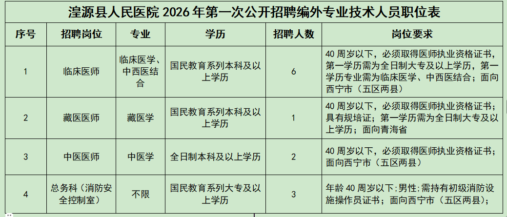 根据《湟源县人民医院2026年第一次公开招聘编外专业技术人员工作方案》,现面向社会公开招聘编外专业技术人员12名,具体有关事项公告如下: