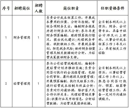 财务管理岗1人,经营管理岗1人,试用期三个月,期间薪酬依照公司薪酬管理办法相关规定执行。试用期合格后,参照公司中层副职待遇标准进行调整,年薪23w-30w。