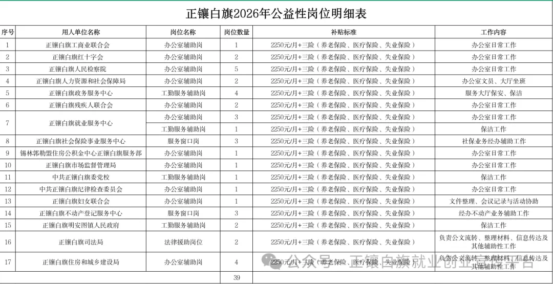根据锡林郭勒盟人力资源和社会保障局《关于加强公益性岗位开发管理的通知》(锡人社办字〔2024〕82号)文件精神,结合我旗实际,现面向社会公开招聘2026年城镇公益性岗位工作人员,具体事宜公告如下: