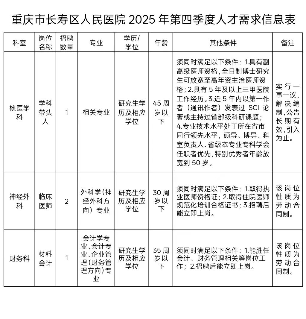简历请以“核医学科学科带头人/神经外科医师/财务科材料会计+姓名”命名简历文档,文档中应附上岗位要求的毕业证、学位证、执业医师资格证、规培合格证等证书材料,发送至邮箱csqyyzp@qq.com。