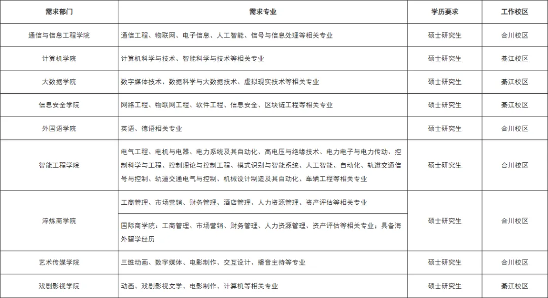 学校有合川、綦江两个校区,现有通信与信息工程学院、智能工程学院、大数据学院、计算机学院、信息安全学院、淬炼商学院等14个二级学院,开设通信工程、轨道交通信号与控制、财务管理、机械设计制造及其自动化(中外合作办学)、电气工程及其自动化(中外合作办学)等48个本科招生专业,其中6个本科专业通过德国学科专业认证协会(ASIN)认证,9个省级特色专业,19门省级一流课程。在校生人数近3.9万人。