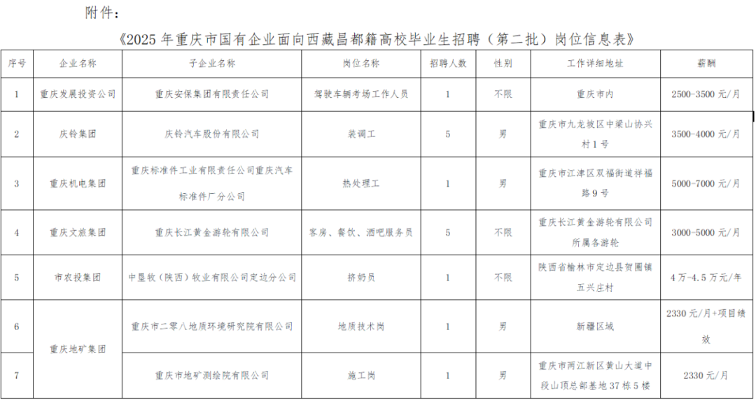 为进一步用足用好2025年重庆市面向昌都籍高校毕业生提供国企就业岗位,提高岗位使用率,现结合第一批招聘情况,对第一批15个未达到岗位招聘条件的岗位进行补录招聘,现将招聘公告如下: