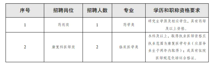 因工作需要,重庆市璧山区第二人民医院现面向社会公开招聘临聘工作人员3人(药剂岗1人,康复科医师岗2人)。