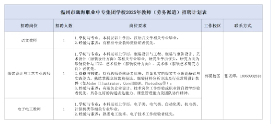 为进一步加强教师队伍建设,更好地满足学校教育教学工作需求,现面向社会公开招聘语文教师、服装设计与工艺专业教师、电子电工教师各1名(劳务派遣)。招聘岗位及相应条件公告如下: