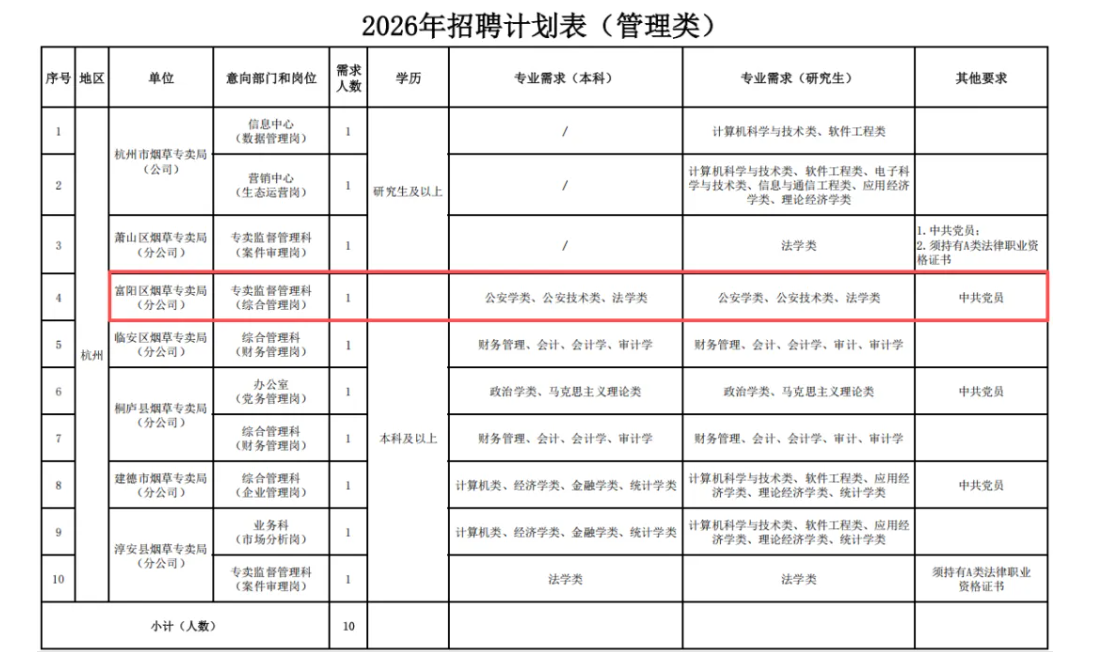 因工作需要,浙江省烟草专卖局(公司)计划开展2026年度全省系统管理类岗位公开招聘。现将有关事项公告如下: