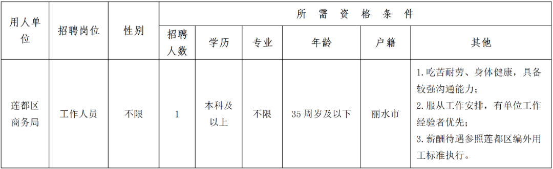 因工作需要,丽水市雷博劳动事务代理有限公司面向社会公开招聘派遣制员工1名,派遣至莲都区商务局,现将有关事项公告如下: