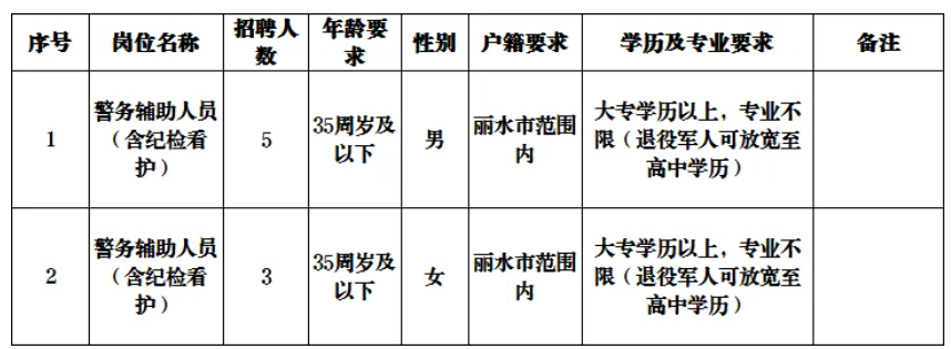 报考人员除应具备报考岗位所需的资格要求(详见计划表)外,还需符合以下条件:1.具有中华人民共和国国籍,拥护中华人民共和国宪法,遵守国家法律法规,品行端正,自愿从事警务辅助工作。2.年满18周岁以上,35周岁以下(截至公告之日)。3.户籍要求丽水市范围内(以2026年3月16日的户口所在地为准)。4.具有大专以上文化程度和履行岗位职责所需的工作能力,并在2026年7月30日前取得毕业证书。具备下列条件的,学历可放宽至高中(中专)及以上:(1)部队退役士兵;(2)烈士、公安英模,因公牺牲和一至四级伤残民警,以及因工(公)死亡、一至四级伤残警务辅助人员的配偶、子女(无配偶子女的可为同胞兄弟姐妹)。5.双侧矫正视力5.0及以上;身体健康,具有正常履行岗位职责所需的身体条件、心理条件和工作能力;6.具有下列情形之一的,不得报考:(1)本人或家庭成员、主要社会关系人参加非法组织、邪教组织或者从事其他危害国家安全活动的;(2)本人家庭成员或主要社会关系人正在服刑或正在接受调查的;(3)受过刑事处罚或者涉嫌违法犯罪尚未查清的;(4)编造、散布有损国家声誉、反对党的理论和路线方针政策、违反国家法律法规信息的;(5)因吸毒、嫖娼、赌博受到处罚的;(6)被行政拘留、司法拘留或收容教育的;(7)被吊销律师、公证员执业证书的;(8)被开除公职、开除军籍或者因违纪违规被辞退解聘的;(9)从事警务辅助工作合同期未满擅自离职的;(10)有较为严重个人不良信用记录的;(11)其他不适宜从事警务辅助工作的。