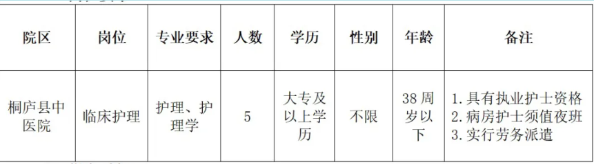 因医院发展需要,桐庐县中医院现对外公开招聘5名护理人员,具体招聘要求如下: