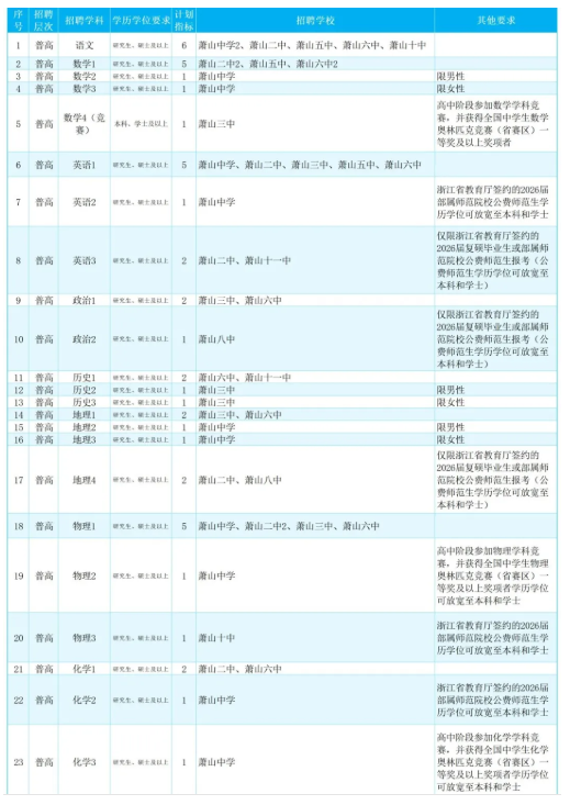 杭州市萧山区发布最新招聘公告,为进一步加强教师队伍建设,决定面向2026届高校毕业生,招聘中小学事业编制教师。具体事项公告如下:
