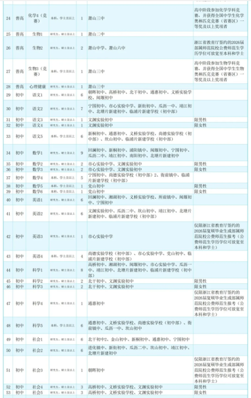 招聘计划指标245名,具体岗位详见《杭州市萧山区面向2026届高校毕业生提前批招聘教师计划表》