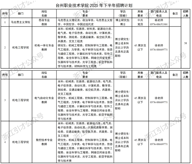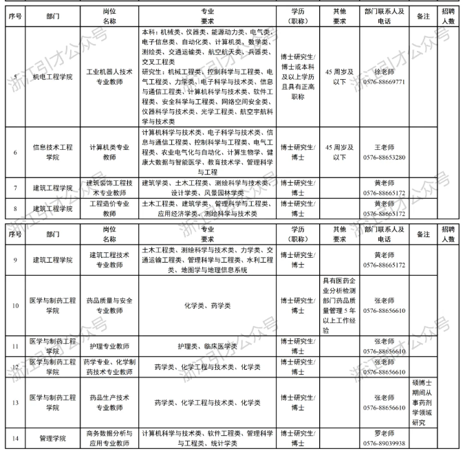 根据我校师资队伍建设的需求及2025年公开招聘情况,按照《事业单位公开招聘人员暂行规定》(人事部令第6号)、《事业单位人事管理条例》(国务院令第652号)、《关于进一步做好事业单位公开招聘工作的通知》(人社部发〔2024〕57号)、《关于进一步做好浙江省事业单位公开招聘工作的通知》(浙人社发〔2024〕72号)以及台州市委组织部市人力社保局《关于进一步加强事业单位公开招聘和人员流动管理的实施意见》(台人社发〔2015〕107号)等文件规定,我校决定面向社会公开招聘,有关事项现公告如下: