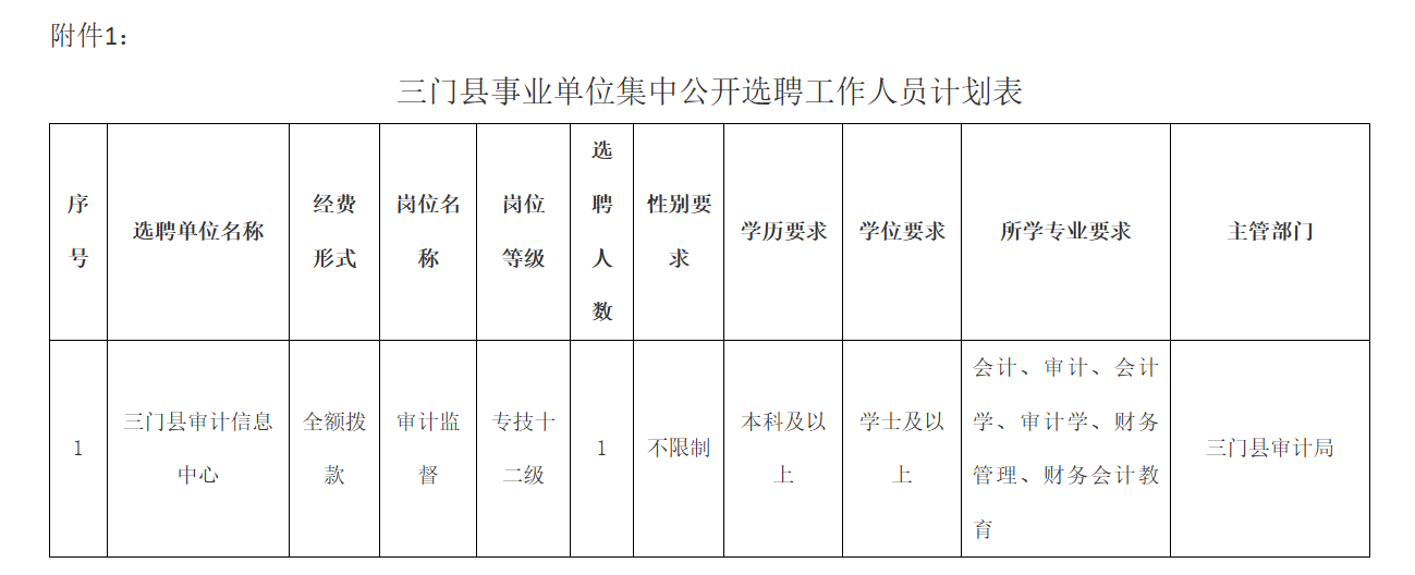 因工作需要,三门县审计局下属事业单位三门县审计信息中心决定在全县范围内选聘财政全额拨款事业编制工作人员1名。现将有关事项公告如下: